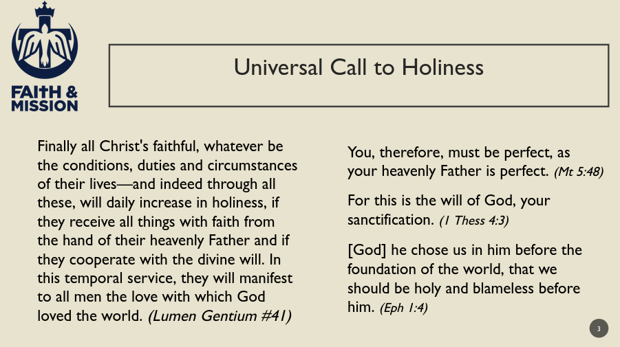 We are calling this Sunday morning Faith formation program Faith in Mission because we want to focus on the critical role the laity plays in the work of the Church Militant, the Church of the people who are alive in the world. As Catholics, we believe the fullness of the Church includes the Saints in Heaven, which we call the Church Triumphant, the Souls in Purgatory, which we call the Church Suffering, and the people of faith on Earth, which we call the Church Militant.