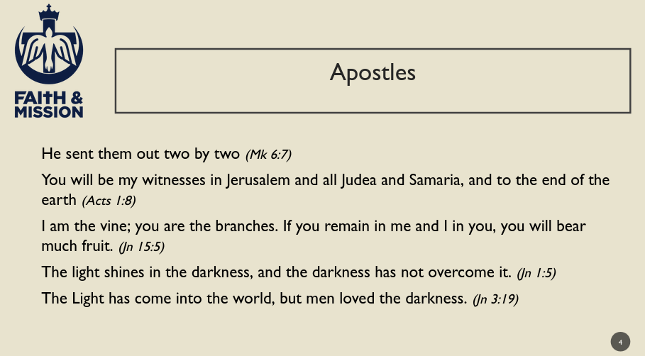 In future sessions, we will return to the themes of Faith and Mission. If we are sent, we need to know where. We need to know what. We need to know what we are seeking to complete our mission. We need to know our faith. Our faith in mission.