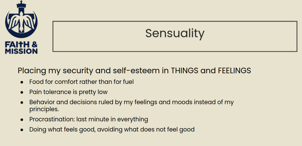 The root sin of sensuality is basically that I put my sense of self in things and feelings. I should get it from God, but instead I get it from stuff and feeling good. Many people who struggle with addiction of one kind or another will learn that their root sin is sensuality. If we use food to make us feel better, or eat when we are bored, that’s a sign. If we base our choices on whether or not it might be hard to do, that’s another indicator. If we can only do good or be productive when we feel like it, that’s another indicator. The Devil whispers in our ear, “It’s too hard!” and “Eat this, or smoke this, or buy this, and you’ll feel a lot better.”