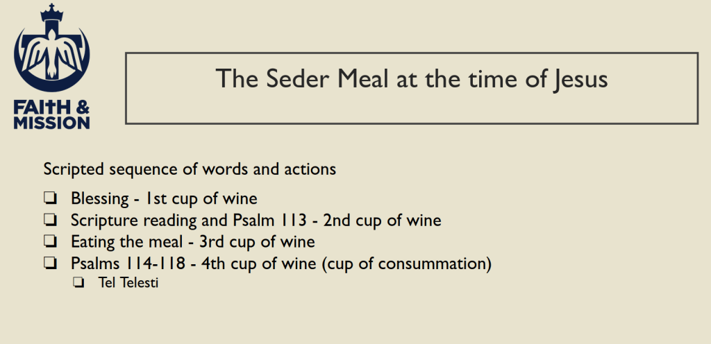 And the structure was set. It began with a blessing, and everyone would drink from the first cup of wine. Then they would have the readings and sing Psalm 113, and they would drink from the second cup of wine. Then they would eat the lamb, the unleavened bread, and the bitter herbs, and they would drink from the third cup of wine. Finally, they would read a series of Psalms, Psalms 114-118, and then drink the fourth cup, the cup of consummation. After the fourth cup, the elder at the table would say, “Tel Telesti” which means “It is finished.”