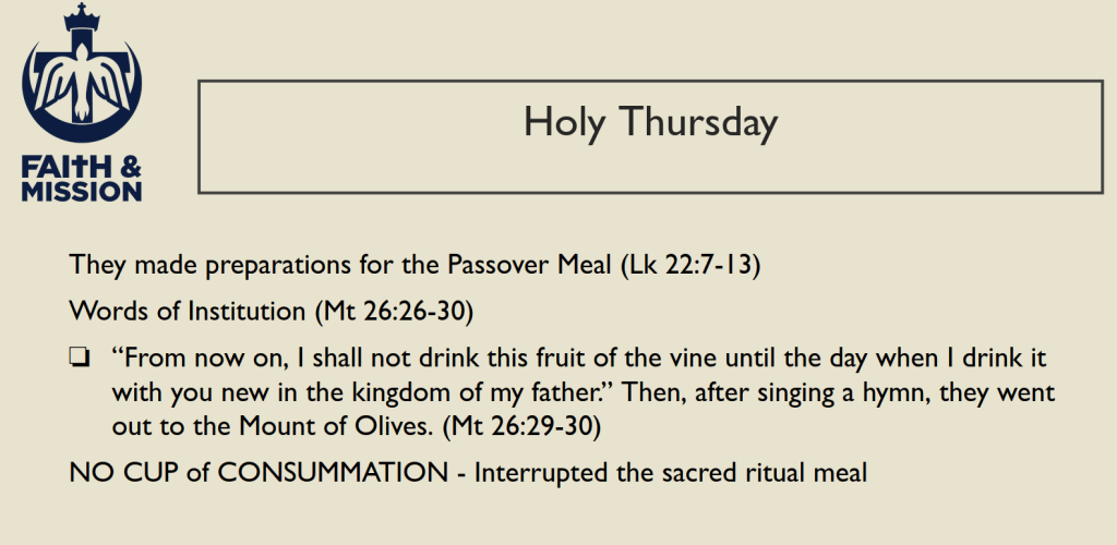 There are a lot of other things going on at this meal on Holy Thursday. But for our purposes today, let’s focus on the fact that Jesus abandons the meal before it is finished. “I shall not drink the fruit of the vine until the day when I drink it with you new in the kingdom of my father.” They sing the Psalms, but they do not drink the cup of consummation, the fourth cup.