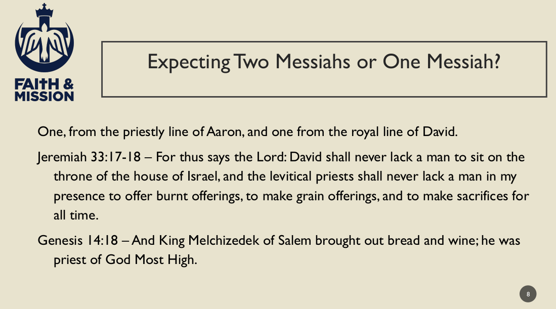 There were other themes of expectation: that a combination priest-king in the order of Melchizedek would return for the final Jubilee and usher in a new Israel.