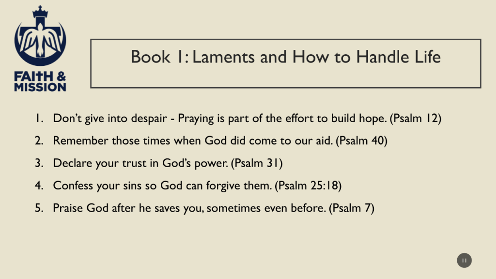 Let’s take a look at how the laments in book 1 of the Psalter are more than just crying about tough times. David, who we acknowledge is the author of most of the Psalms, gives us examples of how to handle hardships in our own life in at least five ways.