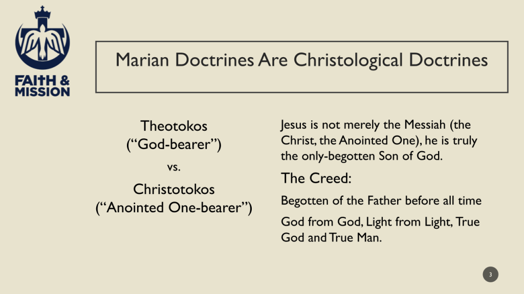 If you think about that for just a moment, you can see how the Marian teaching is derived from the teaching about Christ. The church denied the idea that somehow Christ was a creature. It insisted that Christ was of the same substance as God the father. It also insisted that he had in that one person of the Trinity both the nature of God and human nature. The church word that you see that encapsulates this idea is hypostasis.