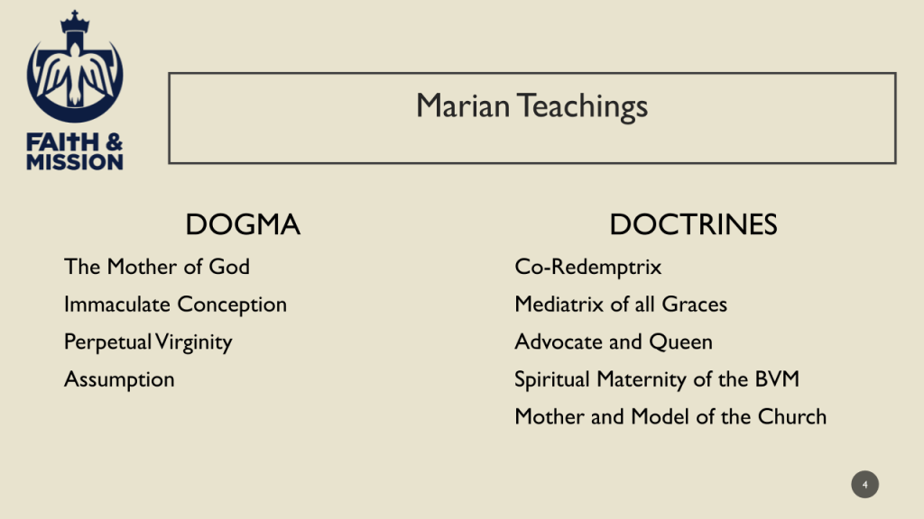 We will spend some time on the principal teachings about Mary, some of which are required for authentic membership in the Church of Christ, and some of which are teachings that may help us grow as disciples of Christ.