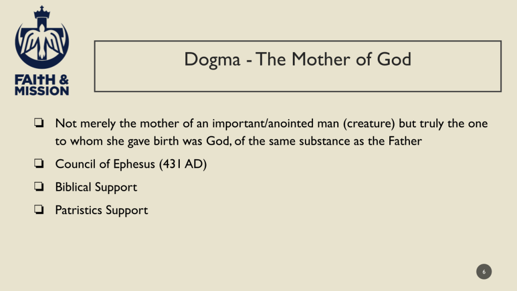 So this teaching about Christ has a natural and obligatory consequence for our understanding of Mary. Because of Jesus, she’s not just a woman, she is the woman by whom or through whom God became man. It is clear from the dialogue in the gospel between the Archangel Gabriel and Mary that Joseph was not the biological father of Jesus. When Mary asked how this would happen she was told that the Holy Spirit would overshadow her. But the consequence of that overshadowing is that Jesus is truly God. Even as he is truly man, he is truly God. And this means that Mary is the mother of God; she is not merely the mother of a great man. Jesus was God from the moment of his earthly conception as man. Always divine because of his being co-eternal with the Father, somehow that divinity coexisted without conflict in the humanity of the human person born in a manger in Bethlehem and killed on the cross at Calvary.
