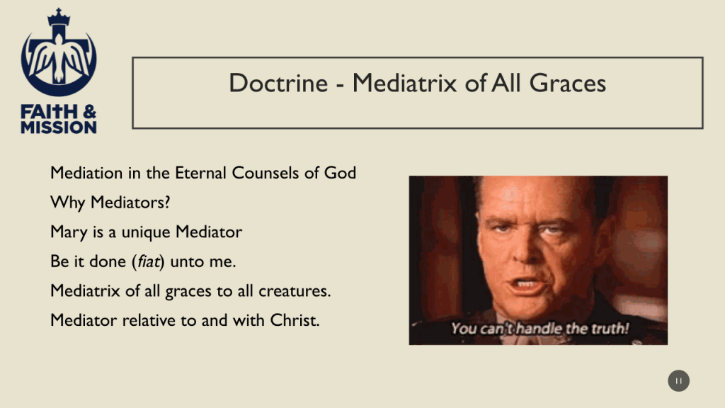 Mary is the mediatrix of all creatures, angels and men, because God in Christ has assigned this function to her in order to reunite all creatures to Christ. The saved are members of Christ’s body in being born spiritually of the Woman, just as all men naturally have Adam as their head and the origin of their humanity through a woman and not otherwise. In herself Mary, without sin, possesses the human nature of Adam that unites her to sinful humanity, the spirit that unites her to the angels, and the fullness of grace that brings her into union with the God-man and so brings him into union with the sons of Adam. Through Mary, Christ descends from Adam and Abraham. Thus, through Mary he is our Savior and Mediator. We go to him the same way: to him through Mary. Her mediation reconstructs the unity between God and man that was broken in the fall and remains wounded. The merit of Christ is absolute, while the merit of Mary is relative because it originates in Christ and is exercised in conjunction with his.